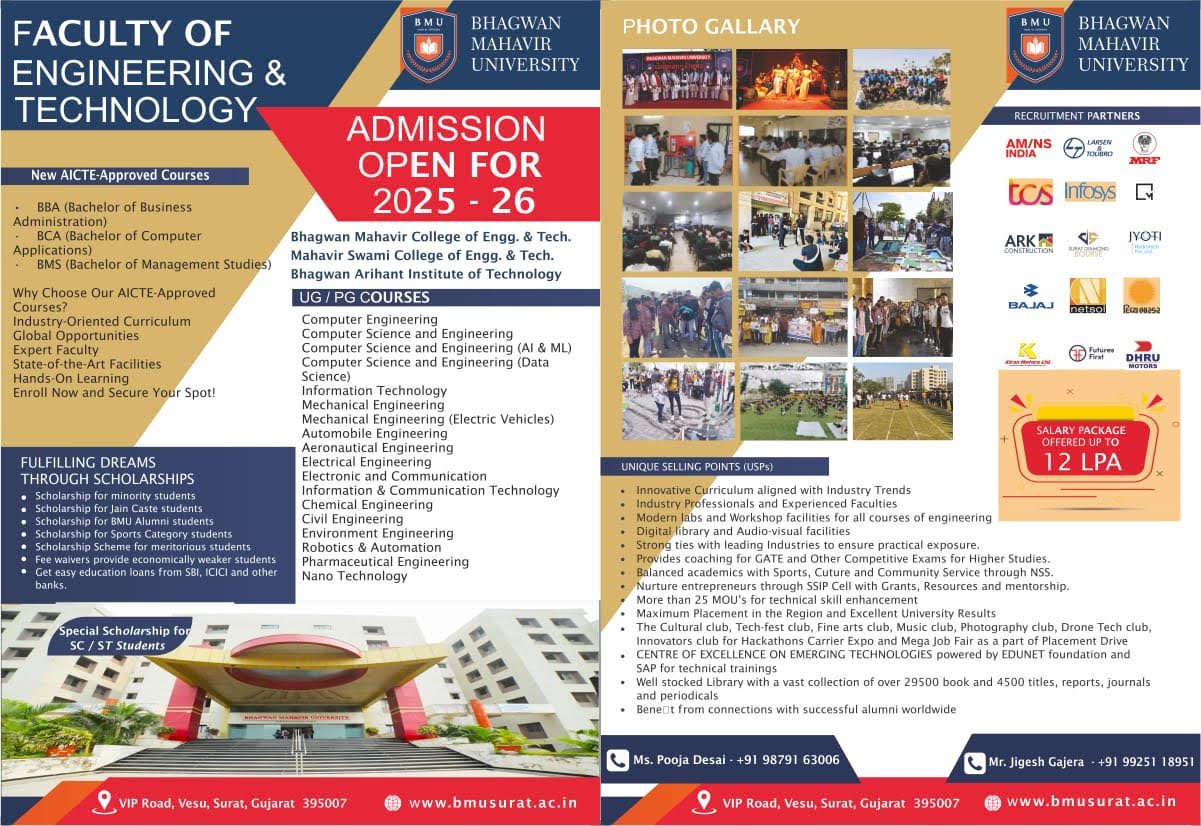 Established in 2017, Bhagwan Arihant Institute of Technology (BAIT), under Bhagwan Mahavir University, is a premier institution dedicated to providing quality technical education in engineering and allied fields. Guided by its vision to promote academic excellence and innovation, the institute nurtures skilled, ethical professionals equipped for global careers. It offers undergraduate programs in Computer Engineering, Information Technology, Chemical Engineering, and Aeronautical Engineering, supported by state-of-the-art infrastructure and an industry-focused curriculum. With strong emphasis on research, practical learning, BAIT prepares graduates to contribute to nation.